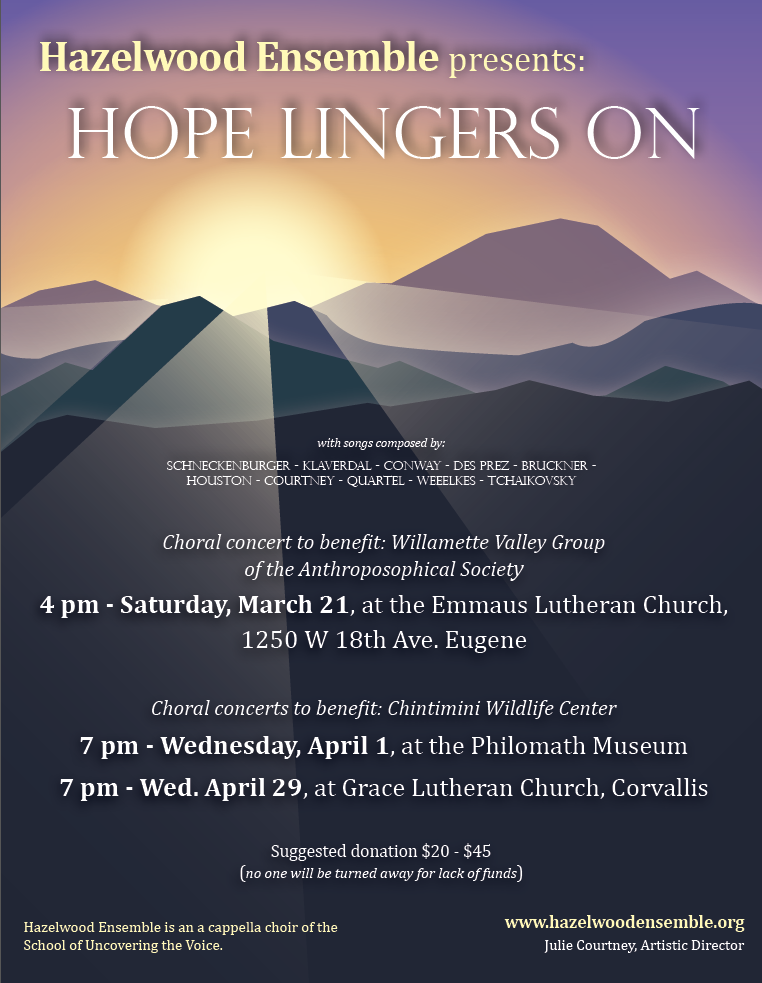 The concert last night was outstanding! What a joy to hear the beautiful songs. When it was over and we were leaving the woman in front of me said, “That was too short!” I agree. It was so sweet to feel the joy. I know you worked hard to prepare for the concert. I’m so glad I came!